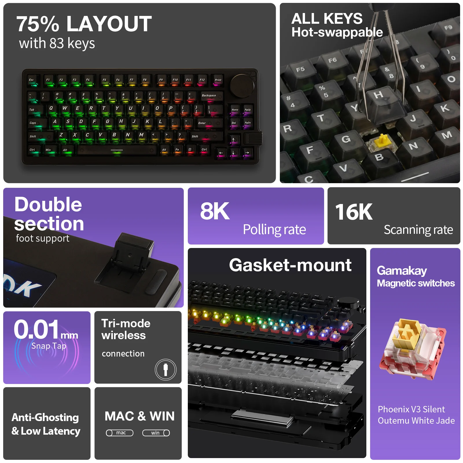 The Gamakay x NaughShark NS75 is a premium Hall Effect magnetic keyboard engineered for competitive gaming excellence. Featuring cutting-edge 0.005mm actuation accuracy with Rapid Trigger and Snap Tap technology, this 75% layout keyboard delivers ultra-responsive performance with an 8K polling rate (8000Hz) and 16K scan rate for ultra-low latency. The hot-swappable magnetic switches, customizable RGB lighting through translucent keycaps, and tri-mode connectivity (Wired/2.4G/Bluetooth) make it the perfect choice for gamers seeking precision, speed, and versatility in a compact design with a multi-function rotary knob.